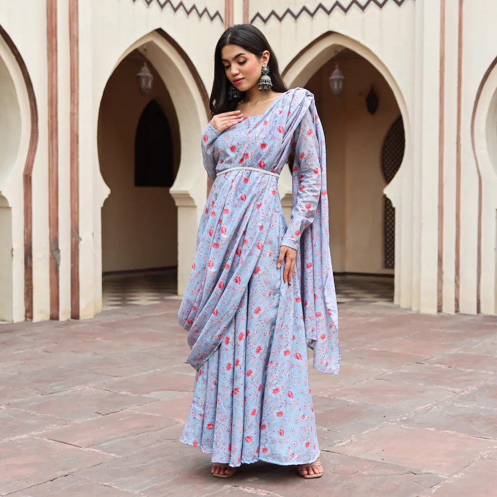 Printed muslin Fit and flare Drape Dress. Note: The Belt is Shown For Styling Purpose Only.