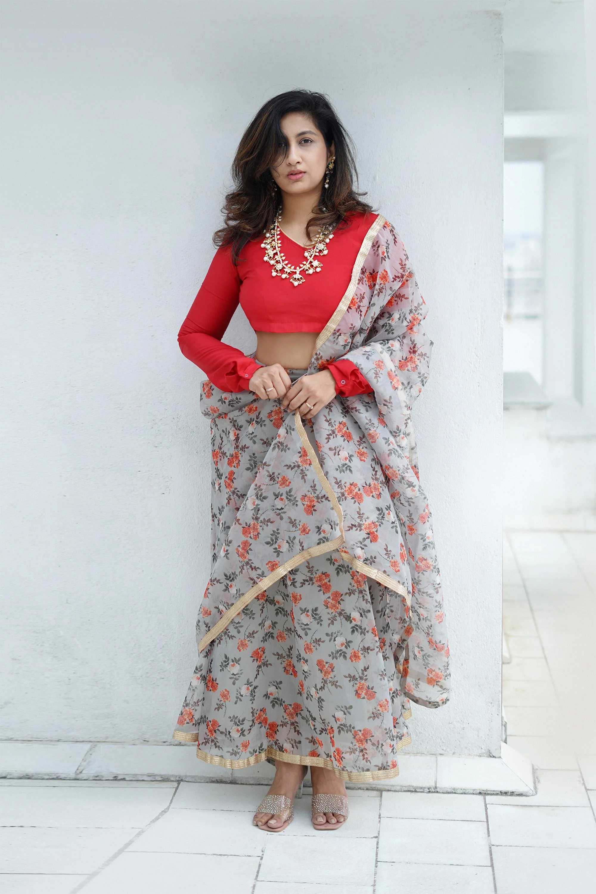 The skirt is made of fine organza fabric and has a side pocket, while the crop top comes with full sleeves and a classy gold trim at the neckline. It's a stylish choice that's both elegant and practical for anyone who enjoys dressing up!
