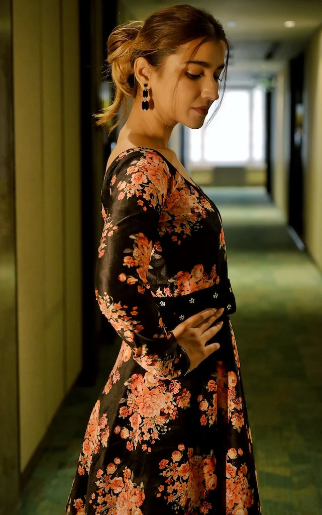 elvet Floral Printed Fit and Flare Gown with Embroidered Belt.