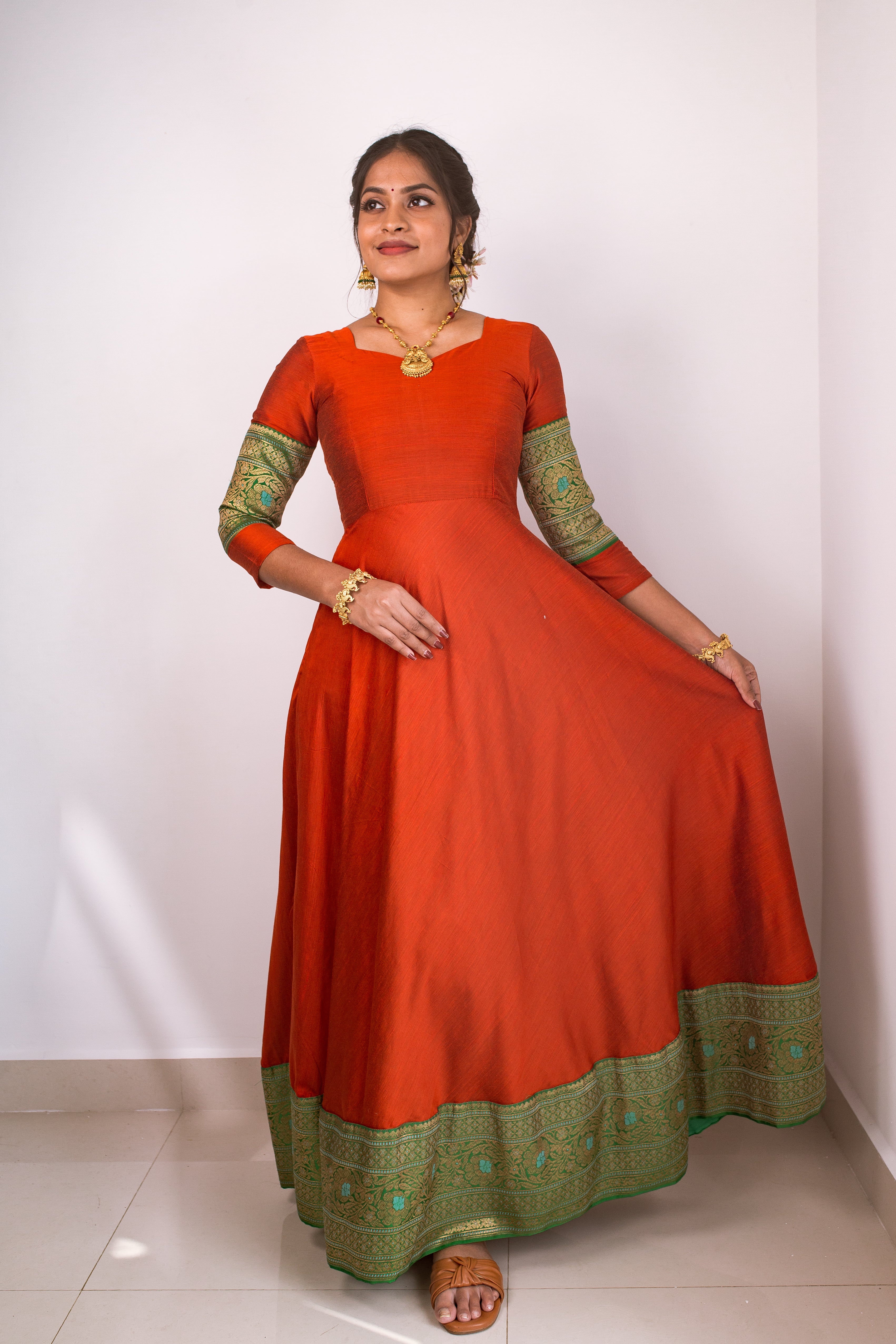 Brick Dress With Green Banarasi border Which is perfect Facinating colour to choose for the festive and Special Occasions.