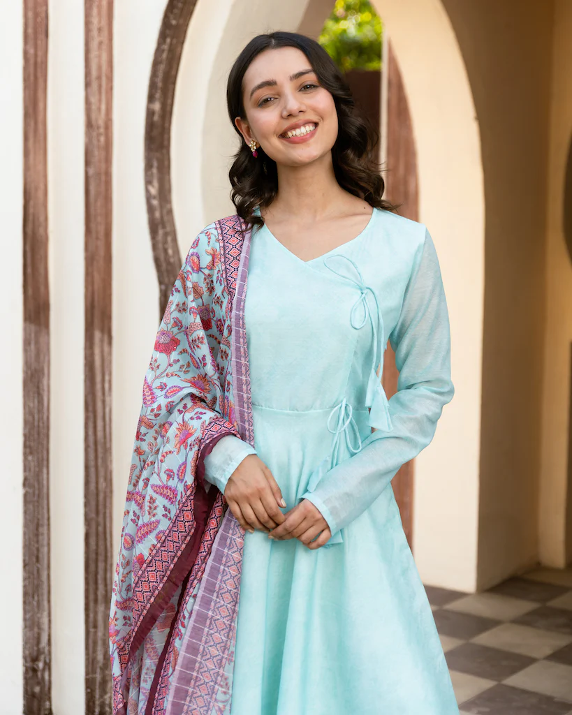 Aqua blue Chanderi Cotton fit and flare dress with printed dupatta.
