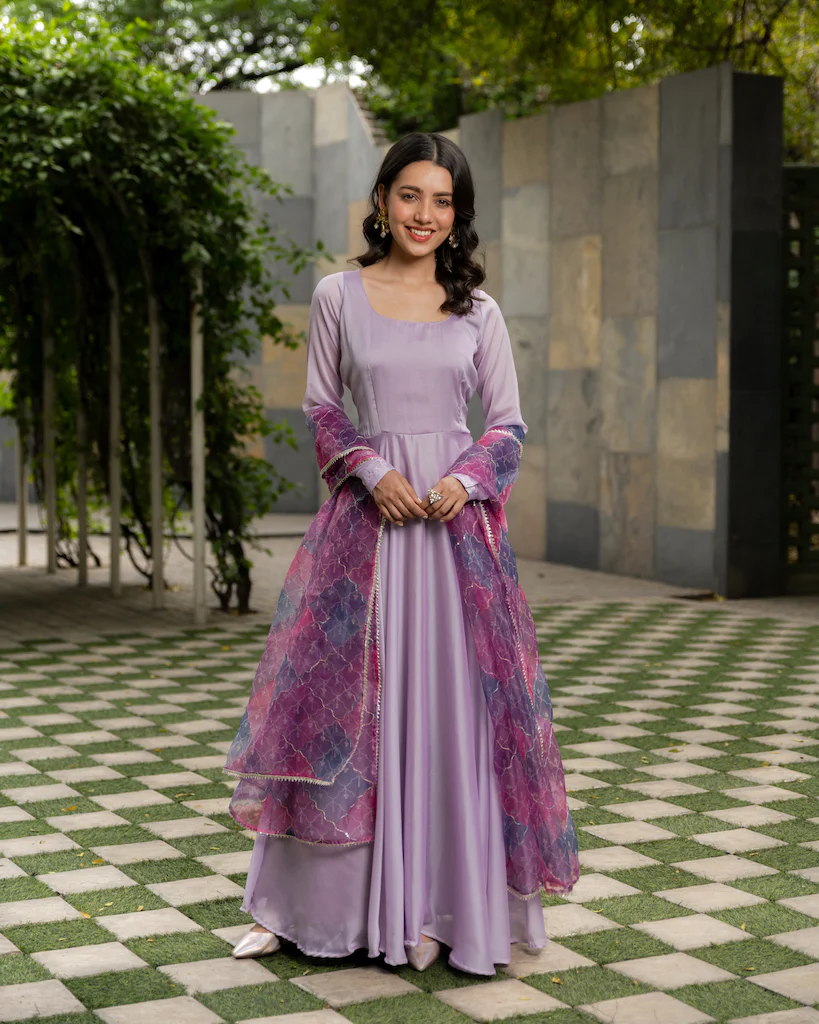 Solid Georgette extensively flared dress with sequin embroidered multicolour Organza dupatta.