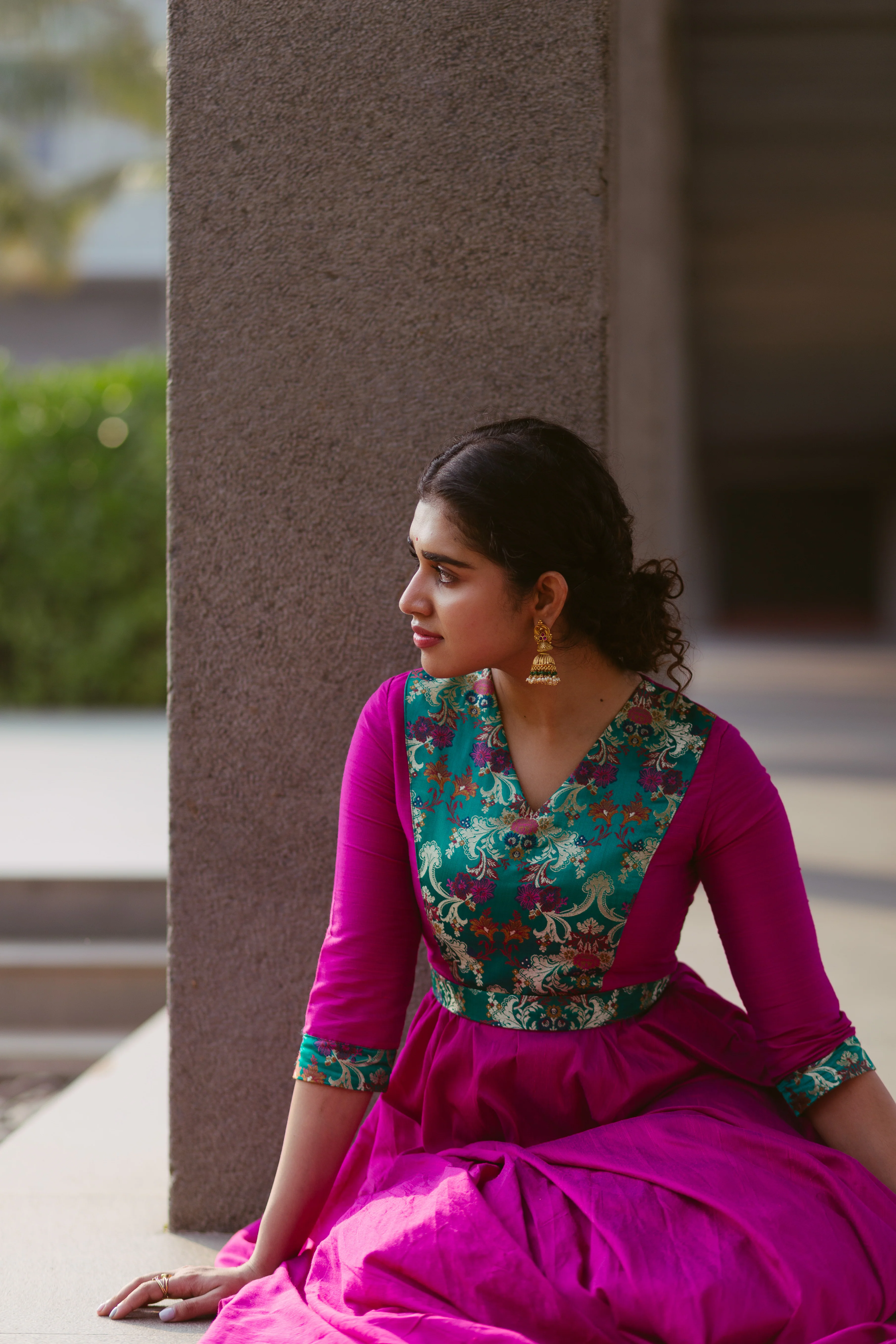Semi silk dress paired with Brocade patch in yoke and sleeve is an elegant festive wear. Cotton Lining provided