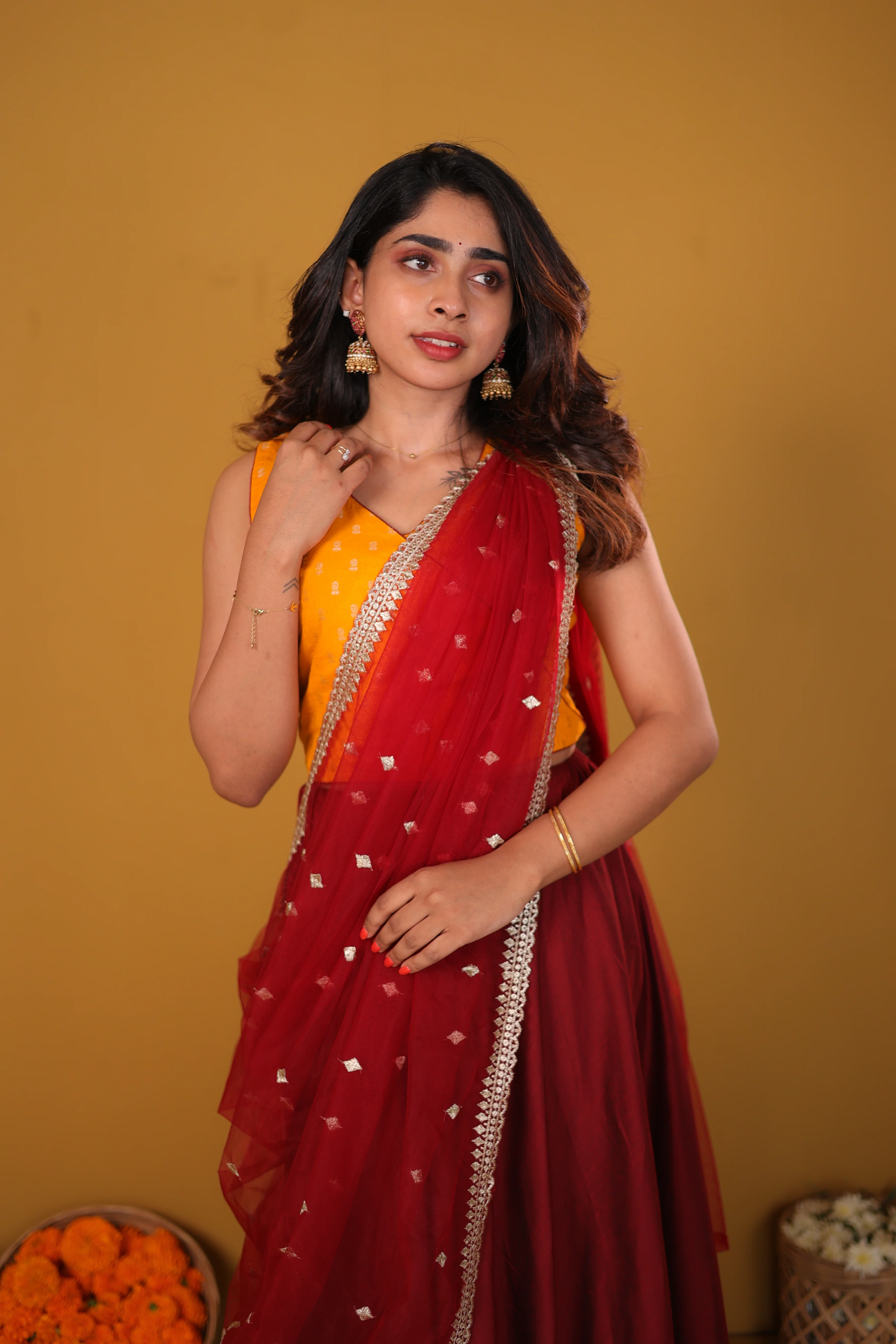 Bask in the glow of festive elegance with this eye-catching crop top, skirt, and dupatta set. The luxurious Chanderi silk skirt in a rich maroon hue flare gracefully with every step, offering the perfect balance of flow and structure. Paired with a stunning mustard-yellow Banaras crop top, adorned with subtle woven details, this set offers both comfort and sophistication.