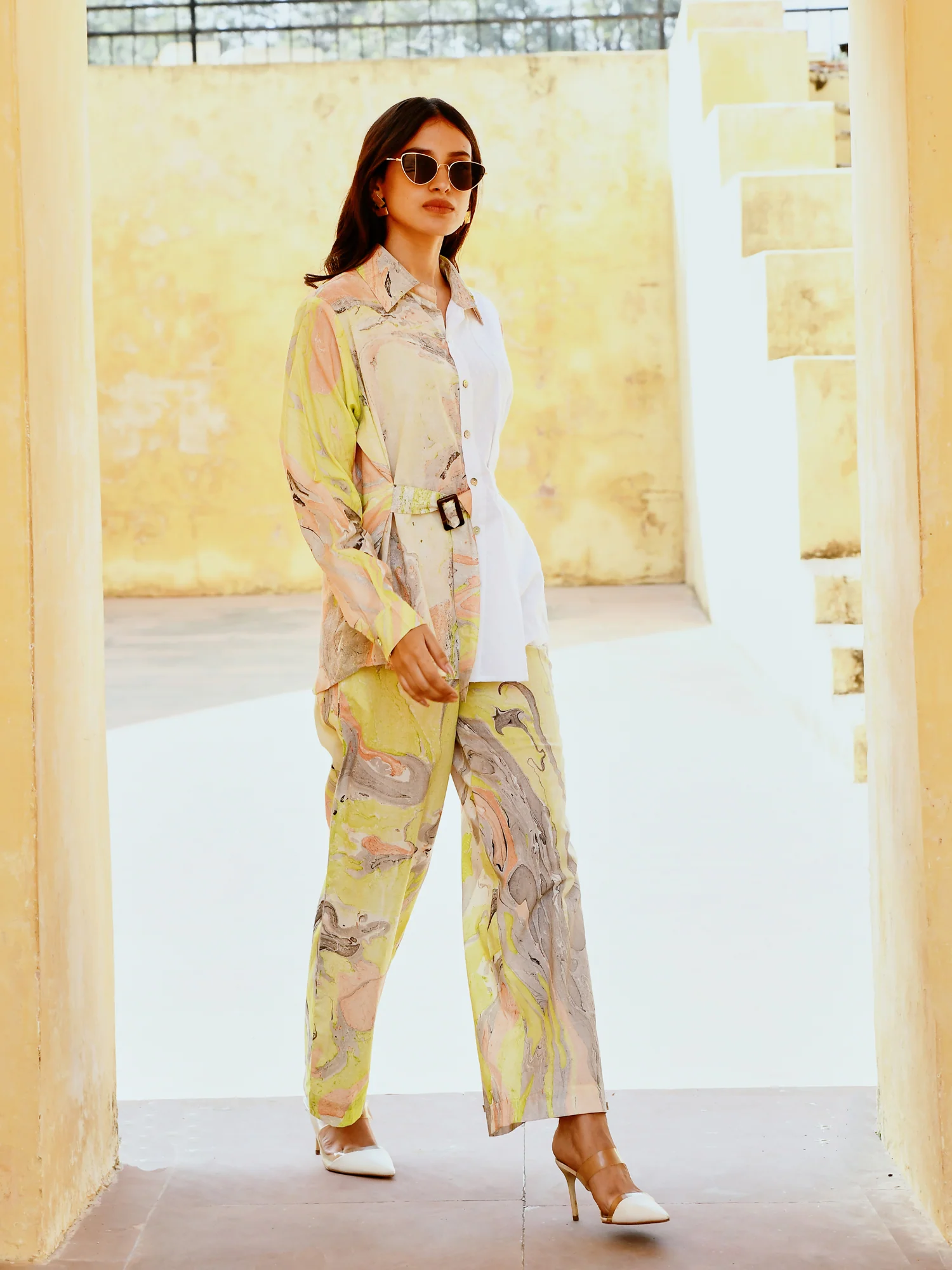 This shirt is a stunning combination of classic white ramboota fabric and bold marble printed fabric. The top is designed with elegant pleats and a sleek belt to cinch the waist, adding femininity to the look. The shirt is finished off with mother-of-pearl buttons adding elegance to the overall look.